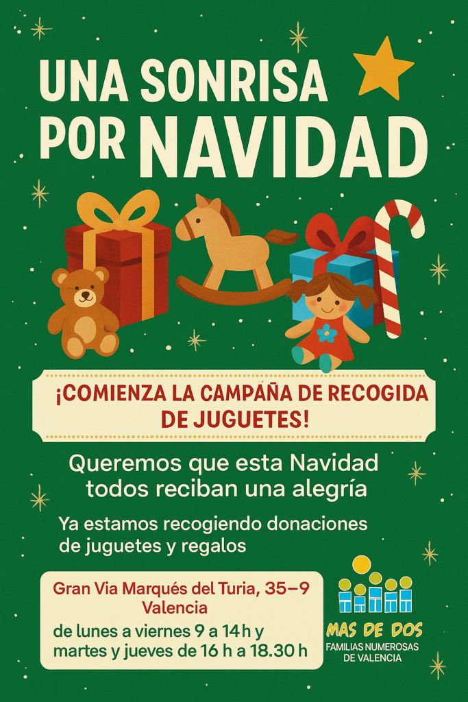 Ya puedes dejar tus juguetes y regalos para los niños de familias numerosas vulnerables en nuestra sede, tanto en horario de mañana de lunes a viernes, como de tardes, los martes y jueves.